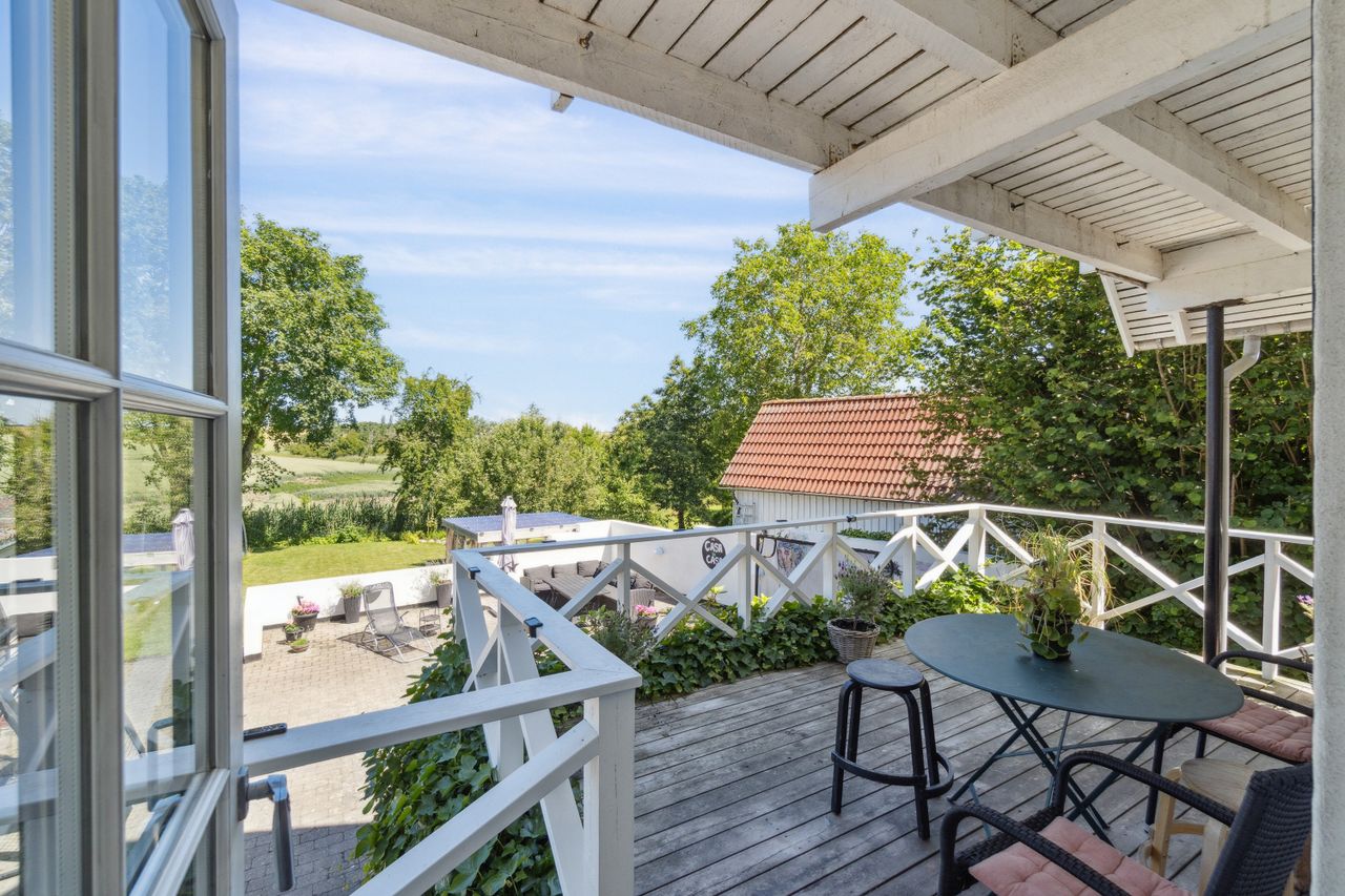 Køkkenet har udgang til den store terrasse, hvor morgenkaffen kan nydes i stilhed med det åbne landskab som baggrund. På førstesalen findes to meget rummelige værelser med mulighed for opdeling samt et soveværelse med eget toilet og udgang til altan. Her opleves udsigten i sin fulde bredde – fra åbne marker til skov og bakker.