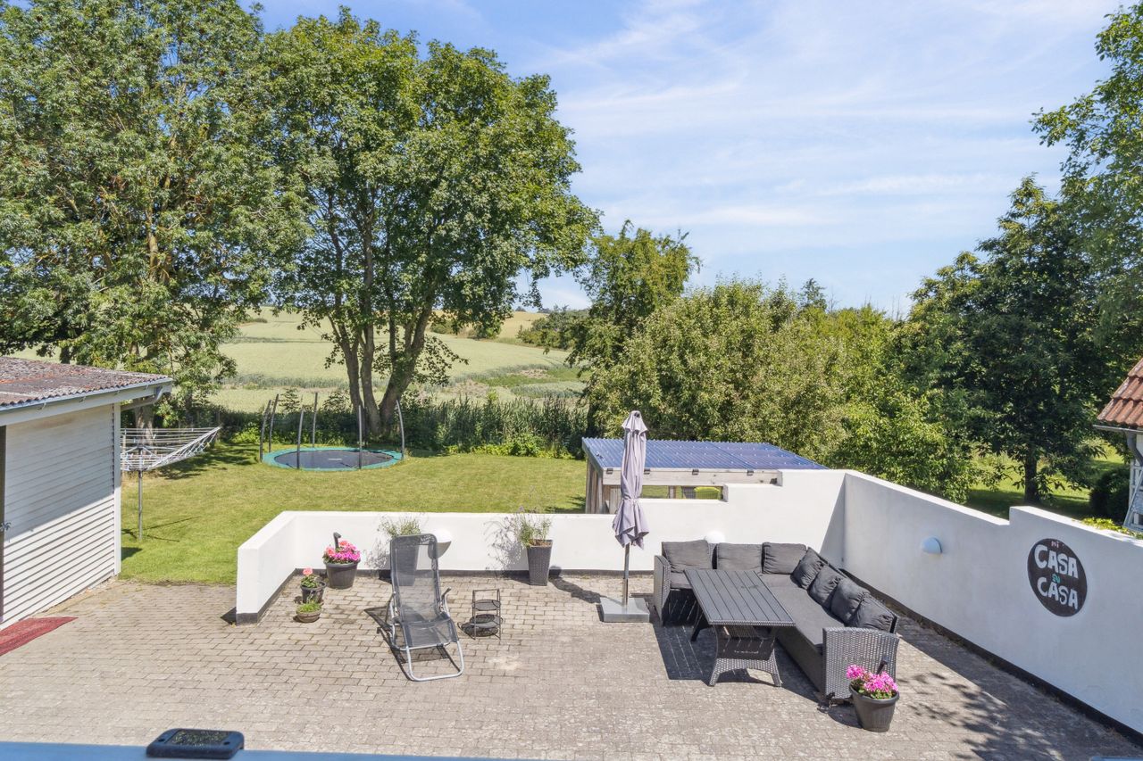 Udendørs byder ejendommen på tre terrasser, en stor gårdsplads og en velanlagt have med plads til både leg, afslapning og udeliv. Dette er en bolig for jer, der prioriterer privatliv, natur og udsigt – og som ønsker et hjem, hvor tempoet sænkes, når solen går ned over markerne.