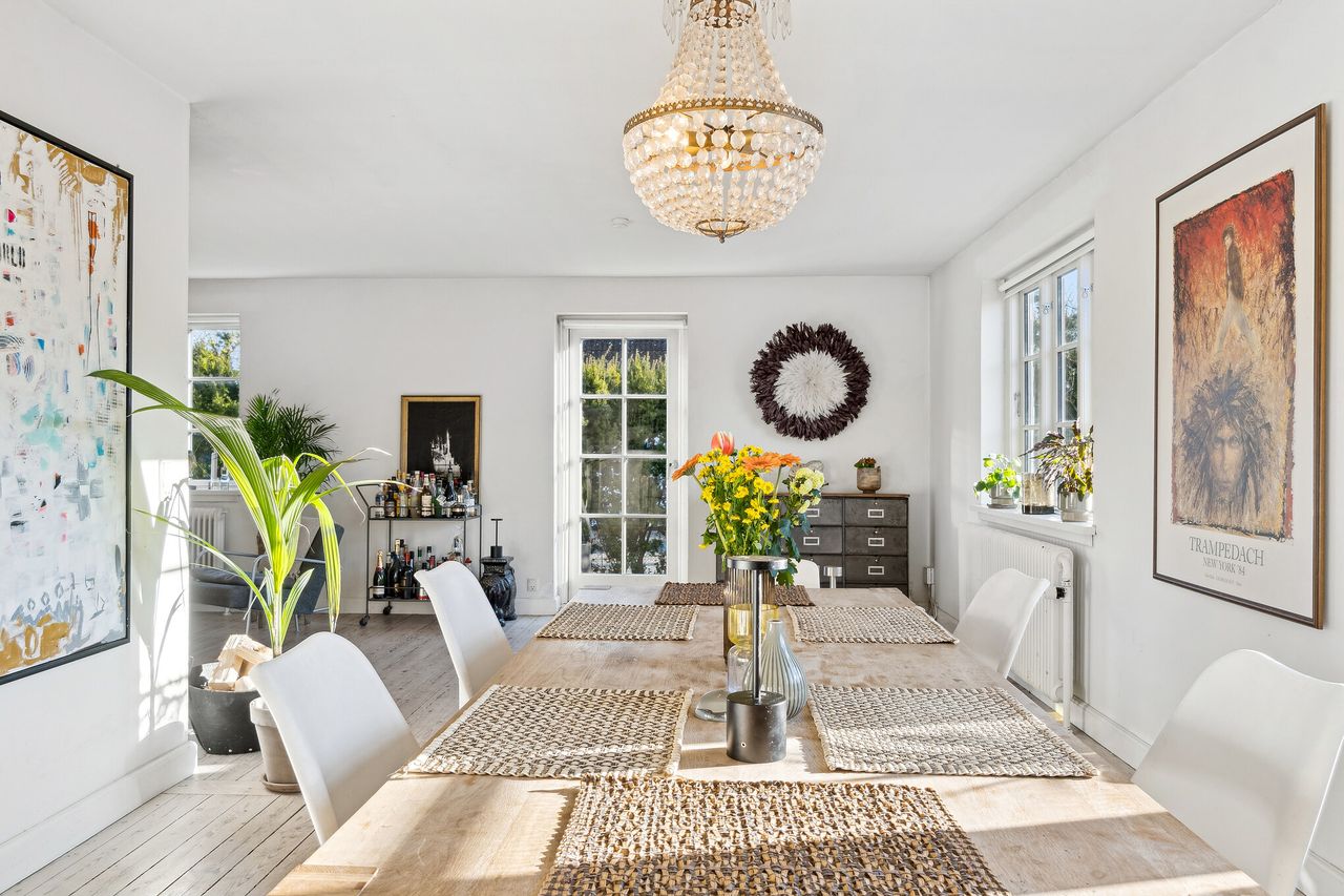 Indenfor samles hverdagen i den rummelige vinkelstue med plads til både spiseafdeling og ophold. Herfra er der direkte udgang til terrasse med fuld udsigt over landskabet, og i de kolde måneder skaber brændeovnen en varm og indbydende stemning. Boligen opvarmes med varmepumper, som sikrer et behageligt indeklima året rundt.