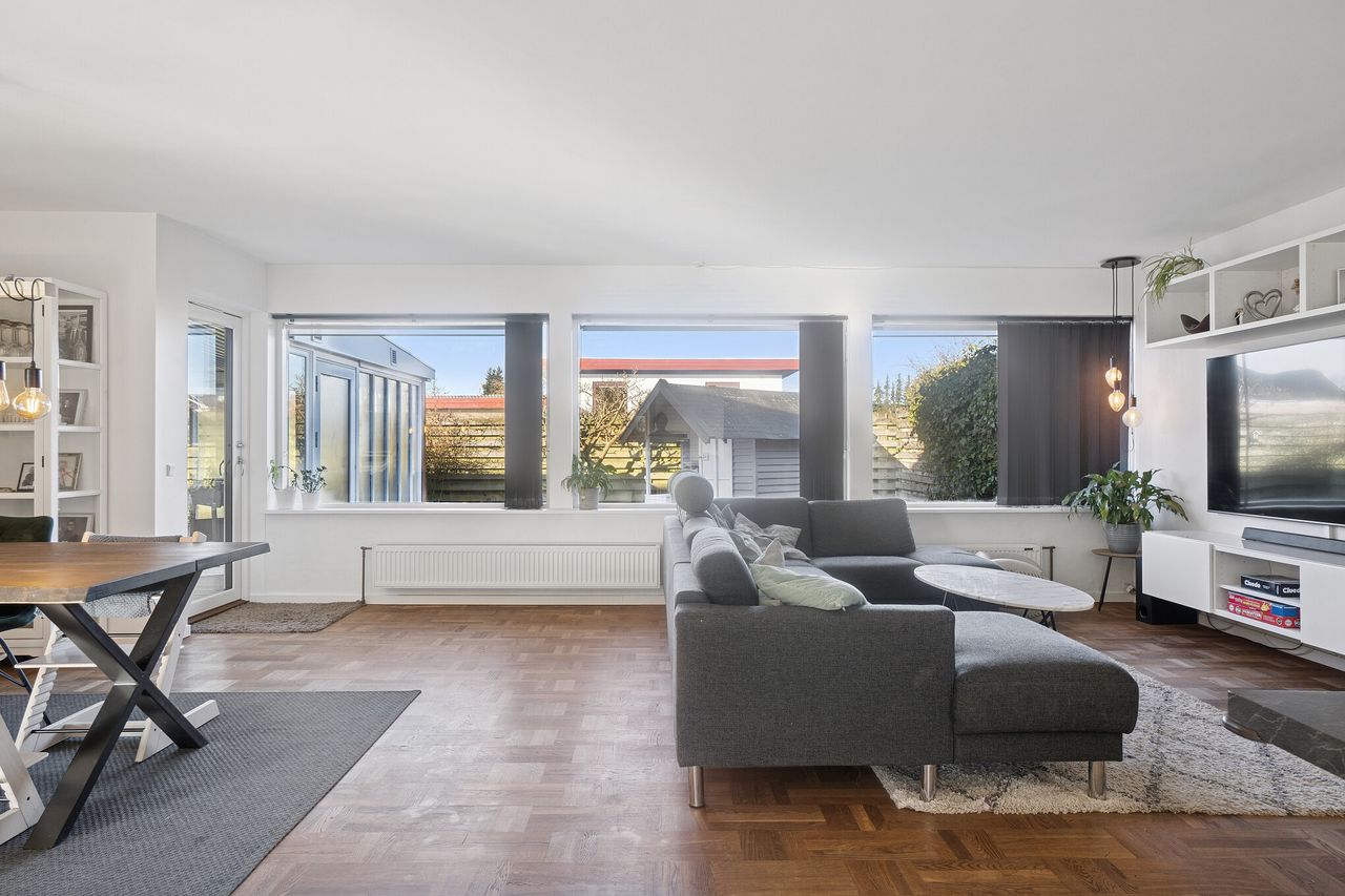 Inden døre er der lagt op til hyggelige stunder, når alle er hjemme fra dagens gøremål. Der kan nemlig tilberedes en lækker lasagne i det stilrene, hvide køkken, mens børnene tager plads i barstolene og fortæller lidt om dagen. I dækker op i spiseafsnittet, før I samles i den bløde sofa til en herlig filmaften. Er det forår, får I nok lyst til at rykke ud på den lukkede, overdækkede træterrasse, der opleves som en udestue og giver sommerfornemmelser. Her er der to havedøre.