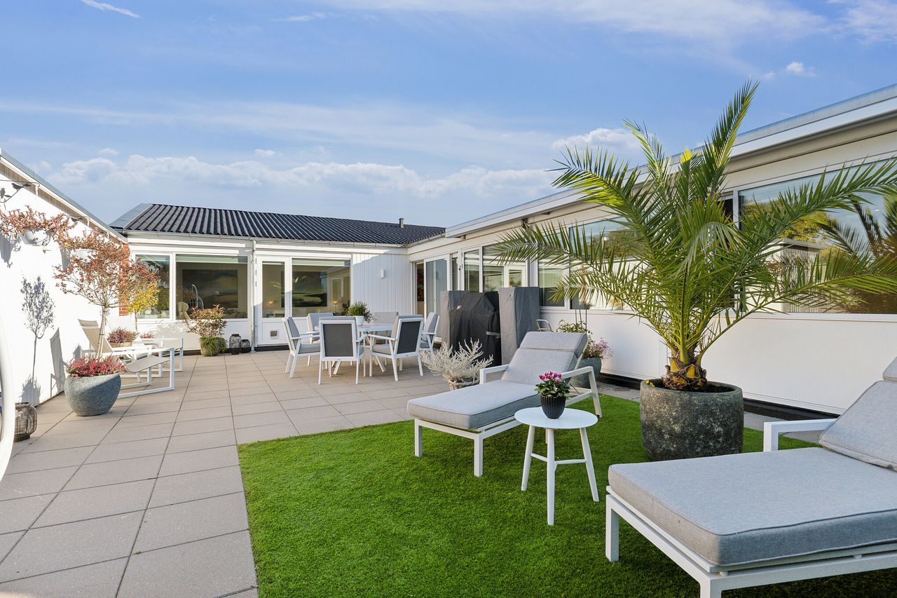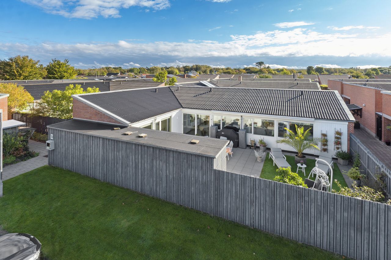 Udenfor får I et privat uderum uden indblik, da huset ligger som det sidste i rækken, hvilket er en sjældenhed i Favrholmvænget. Imens bliver den sydvestvendte terrasse et kærkomment samlingspunkt, hvor solen kan nydes hele dagen.