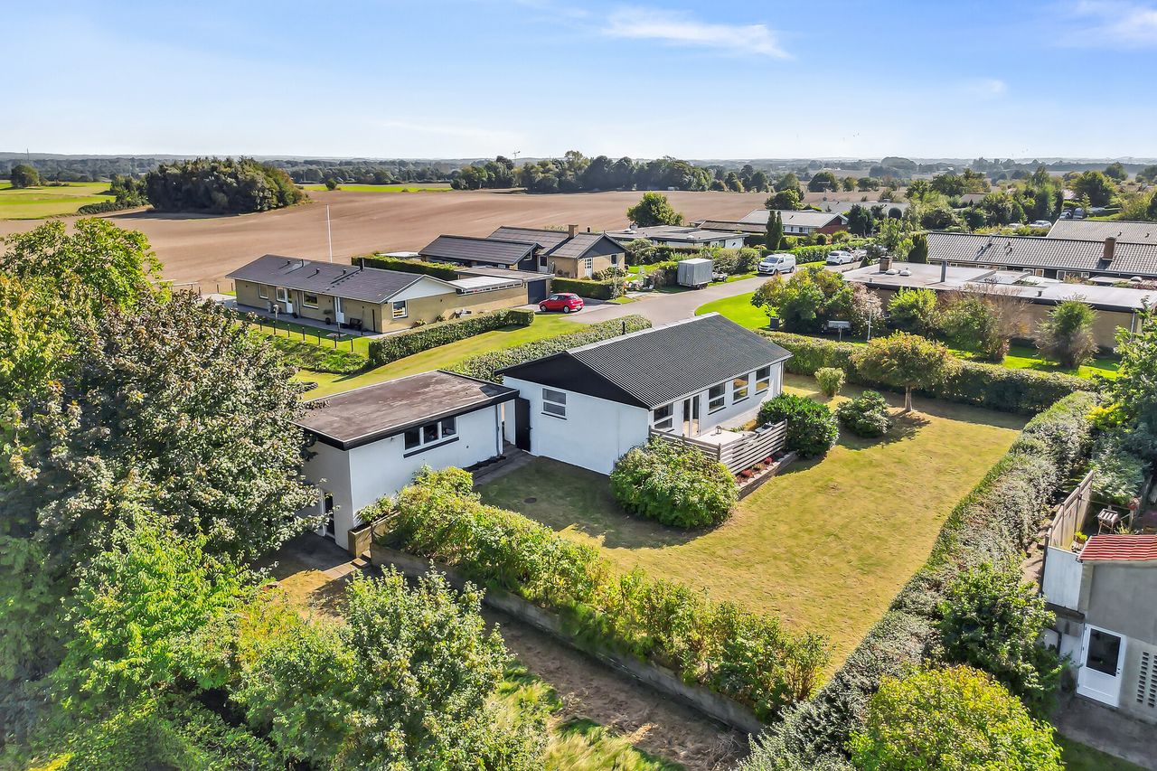 Ejendommen fremtræder velholdt med nymalede facader, nyt sadeltag fra 2024 og lavenergi-vinduer med trelags-termoruder og tyverisikring og meget mere. Også haven præsenterer sig ved ankomst. Den består hovedsageligt af græs med stedvise buske og træer, og det hele er omkranset af hæk. Bagerst på grunden er der et græsstykke med bålplads samt gode muligheder for boldspil. Helt ny robotplæneklipper medfølger.