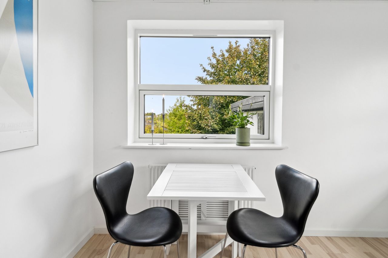 Inden døre møder I en lys og rummelig bolig, hvor en stor stue og et nyt spisekøkken udgør de primære opholdsrum. I får masser af plads til at indrette hyggelige sektioner i stuen og samle familien på tværs af madlavning og andre aktiviteter i køkkenet. Sollyset strømmer ind gennem de sydvestvendte vinduer i stuen, hvorfra der også er adgang til træterrassen.