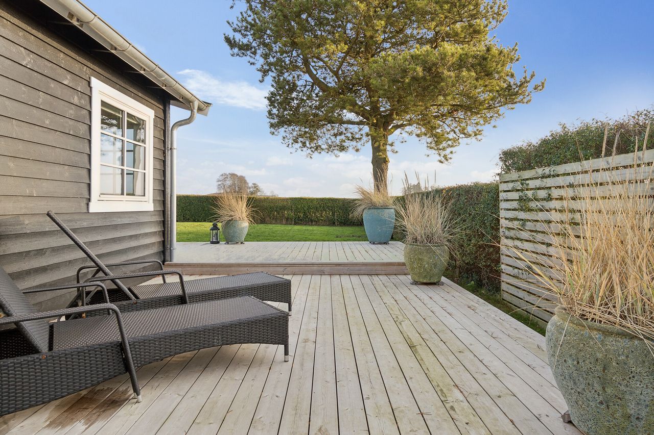Sommerhuset præsenterer sig charmerende med sin sortmalede træfacade, der komplementeres af hvide vinduesrammer og døre. Grunden er anlagt i en vedligeholdelsesvenlig stil med græsplæne og let beplantning, som alt sammen kan nydes fra jeres træterrasse, der er orienteret optimalt, så I fra morgen til aften kan nyde solens stråler. Fra terrassen er der desuden en smuk udsigt over det åbne landskab og Arresø. Dertil kommer et anneks med to disponible rum.