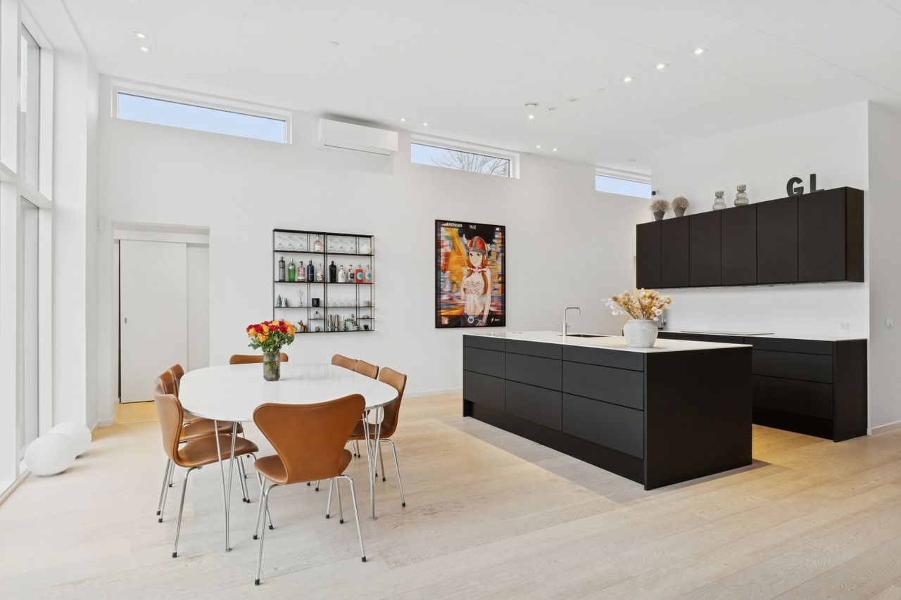 Huset er bygget for 8 år siden og står klar med moderne, nem luksus. Den slags med motoriserede skuffer, smarte systemer til at programmere lyset, og kvalitet i materialerne. Alt er i orden og designet til det bekvemme, afslappede liv. Med kæmpe carport og en professionelt anlagt have, der med vilje er minimalistisk, så der ikke er havearbejde. Gennemtænkt til de, der hellere hygger med drinks på terrassen, end luger ukrudt. Afdelingerne til børn og voksne skaber privatliv, og køkkenalrummet evner at samle hele familien, inklusive teenageren der ellers hellere ser på TikTok.