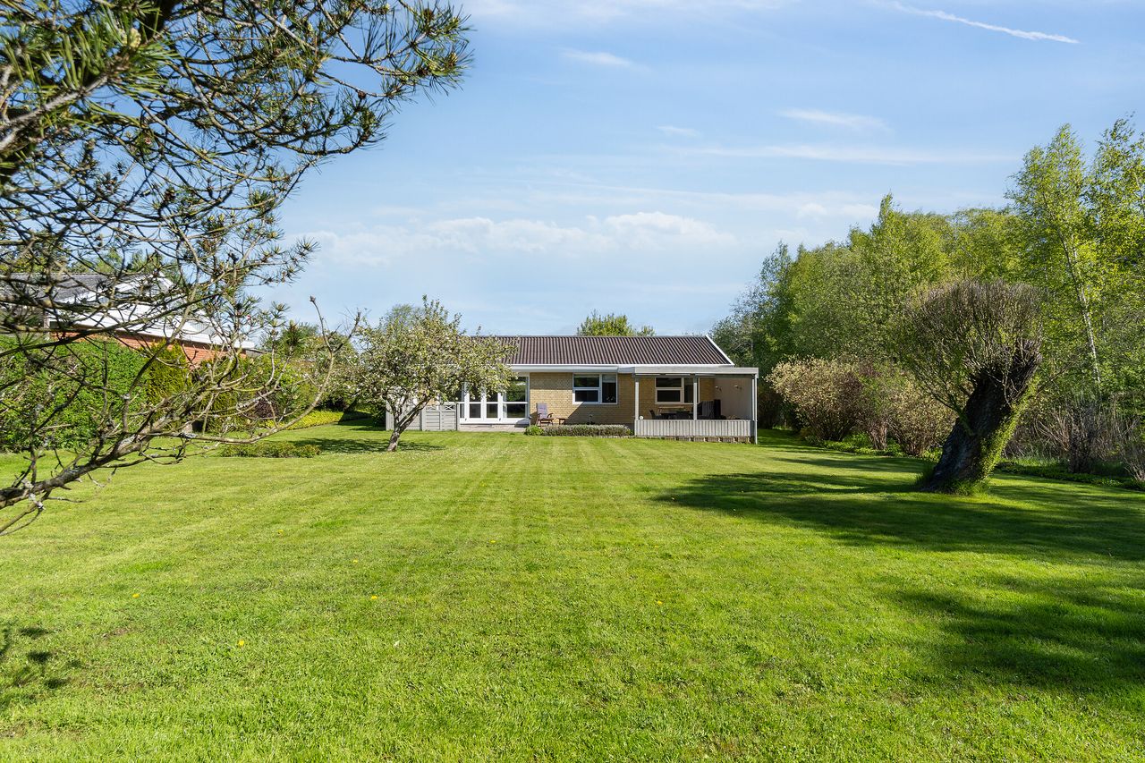 Træd ud i haven og se for jer, hvordan sommerdagene bliver en sand fornøjelse. I skal nemlig ikke bekymre jer det store om vedligehold, så i stedet kan I bruge tiden på leg og afslapning. Sidstnævnte bliver helt sikkert på den brede, delvist overdækkede terrasse, mens den store græsplæne kalder på kongespil, vandkampe, boldspil og meget mere. Indkørslen er flisebelagt og leder til en carport.