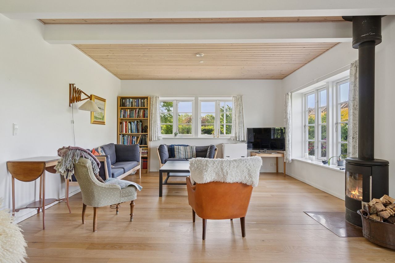 Ejendommen fremtræder yderst charmerende med sin lyse træfacade og hvide vinduespartier. Indenfor byder stueplan på et åbent opholdsrum, der danner den perfekte ramme om familietid og samvær. Køkkenet er funktionelt med god skabsplads og de nødvendige hvidevarer, og stuen indrettes let med spisebord og sofagruppe, som med fordel kan placeres nær den stemningsskabende brændeovn. Derudover rummer stueplan et værelse, et badeværelse og et praktisk bryggers.