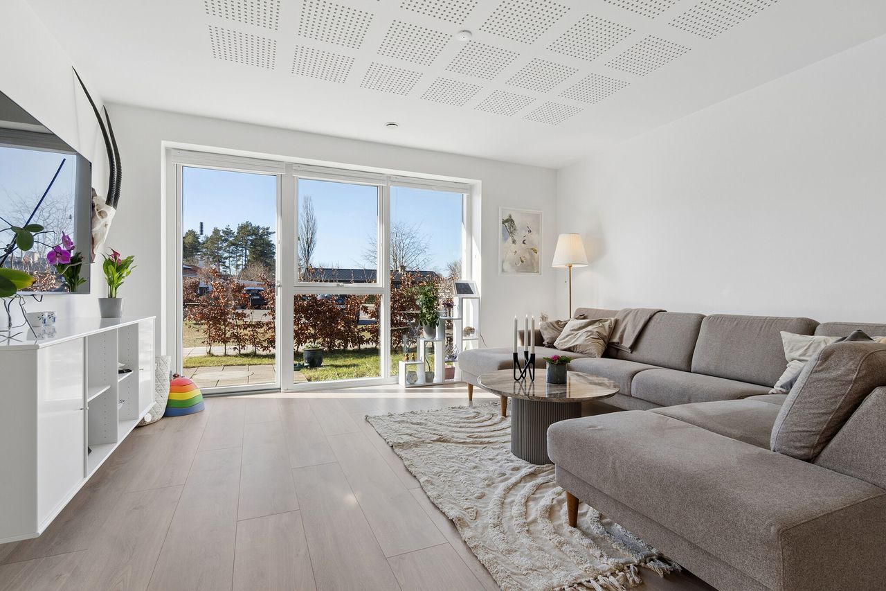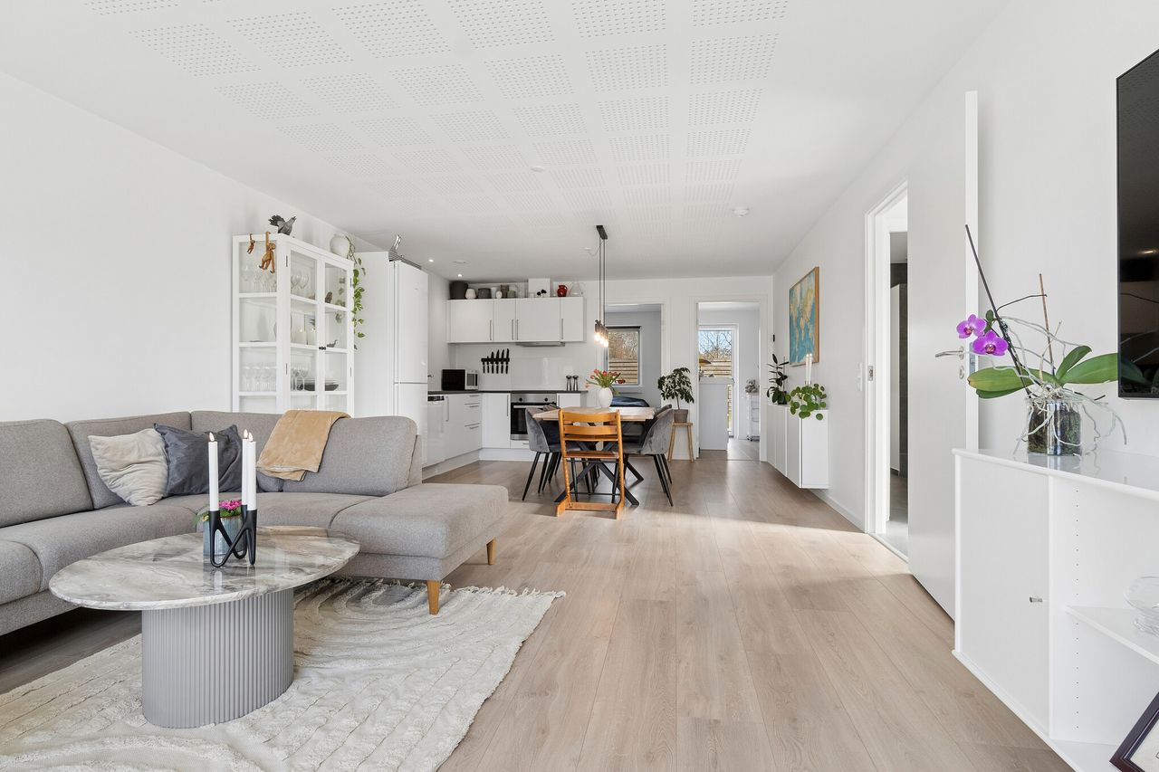 Indenfor mødes I af en entré med faste skabe til overtøjet, og herfra er der adgang til boligens praktiske bryggers med god opbevaringsplads og vaskefaciliteter. Videre når I hjemmets samlingspunkt i form af køkken-alrum og stue, som ligger i åben forbindelse og skaber en skøn sammenhæng mellem madlavning, måltider og afslapning. Det moderne køkken har masser af bordplads, mens stuen bades i lys fra de store vinduespartier. Boligen rummer desuden to gode værelser med mange indretningsmuligheder samt et pænt badeværelse holdt i lyse materialer, hvilket fuldender den harmoniske indretning.