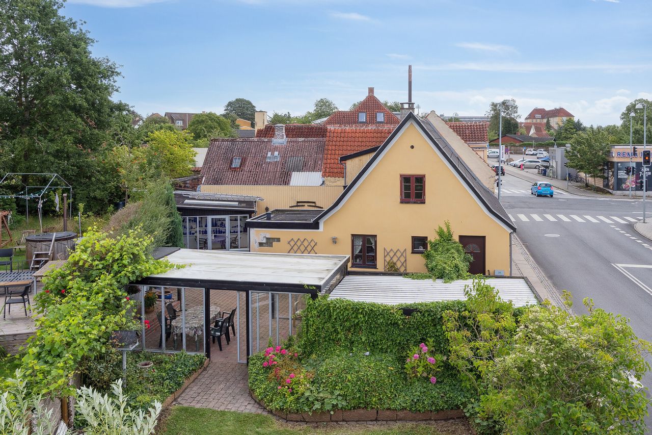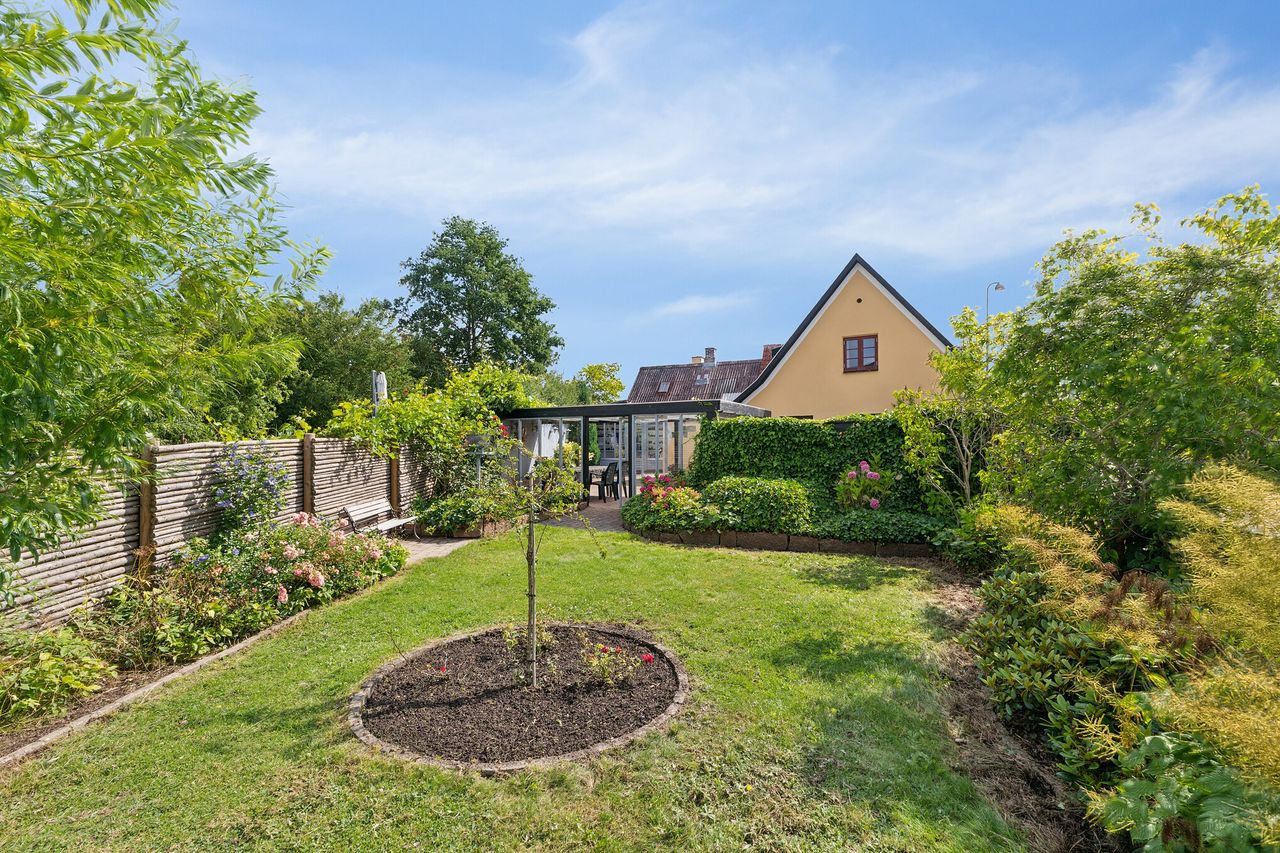 Her overtager I nøglerne til en bolig i fin stand, som tilmed byder på en hyggelig have med gode solforhold. Ejendommen fremtræder charmerende med sin gule facade, der komplementeres af mørke vinduespartier og tag.