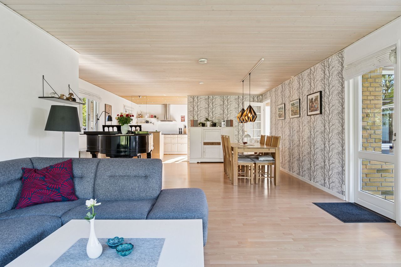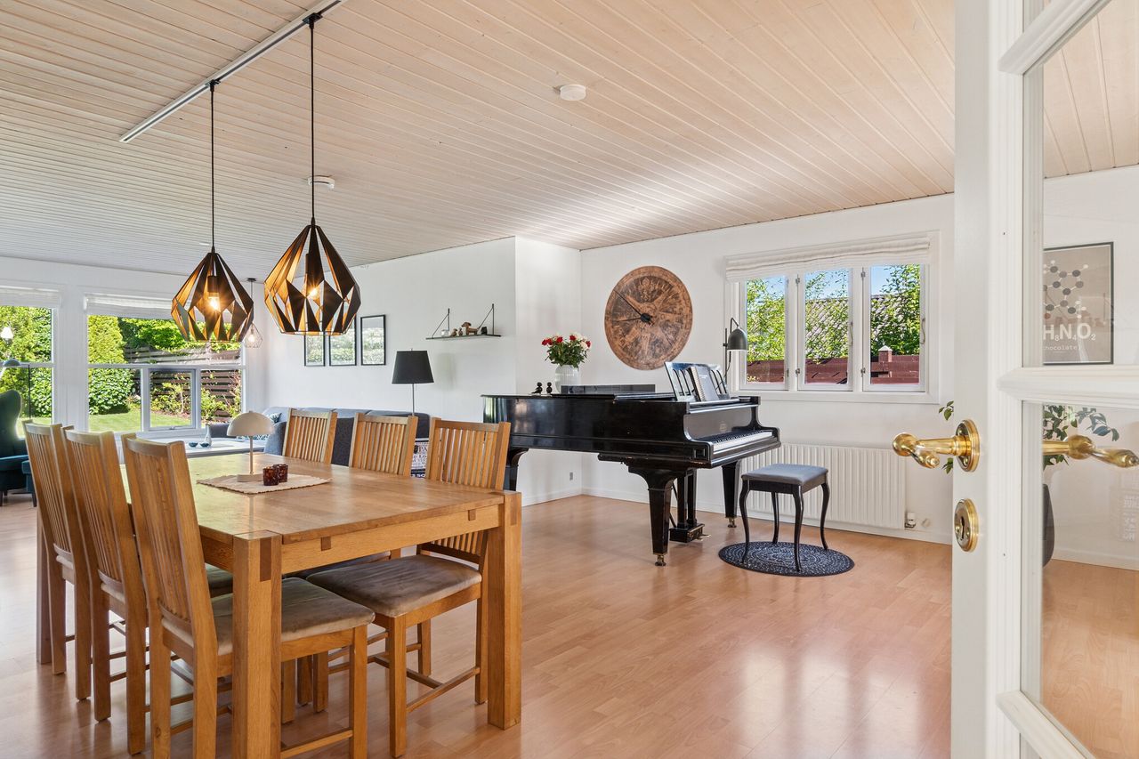 Det velholdte hus er helt i tråd med den flotte forhave, som består af stenbede i niveauer, og I får ligeledes en dobbelt carport med i købet. I træder indenfor i en centralt placeret entré, hvorfra I kan tilgå alle rum i stueetagen. Til den ene side ligger et stort, lyst køkken-alrum, der udgør familiens samlingssted, hvor I kan lave mad side om side med kreative sysler og andre aktiviteter. Samtidig er køkkenet let afgrænset fra stuesektionen, og der er masser af plads til at skabe hyggelige opholdssteder.