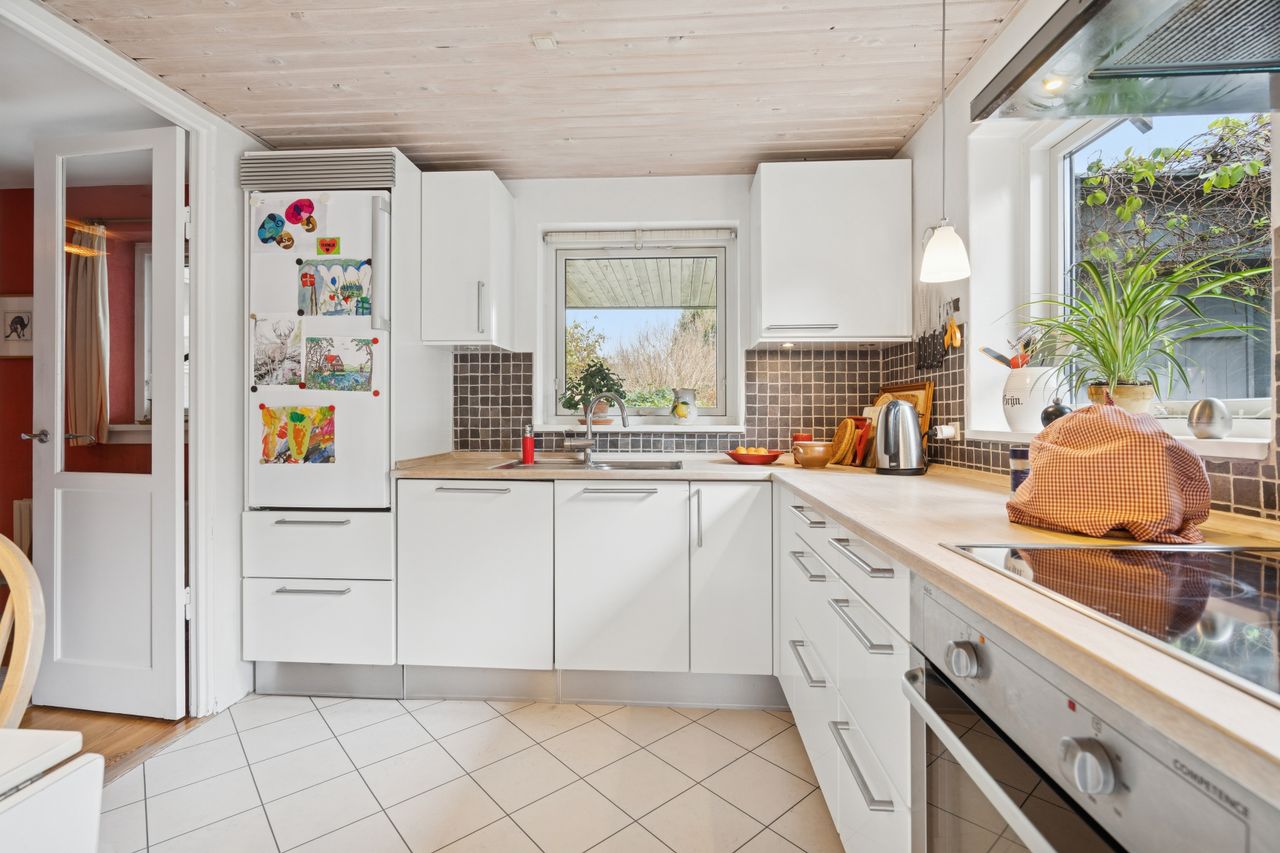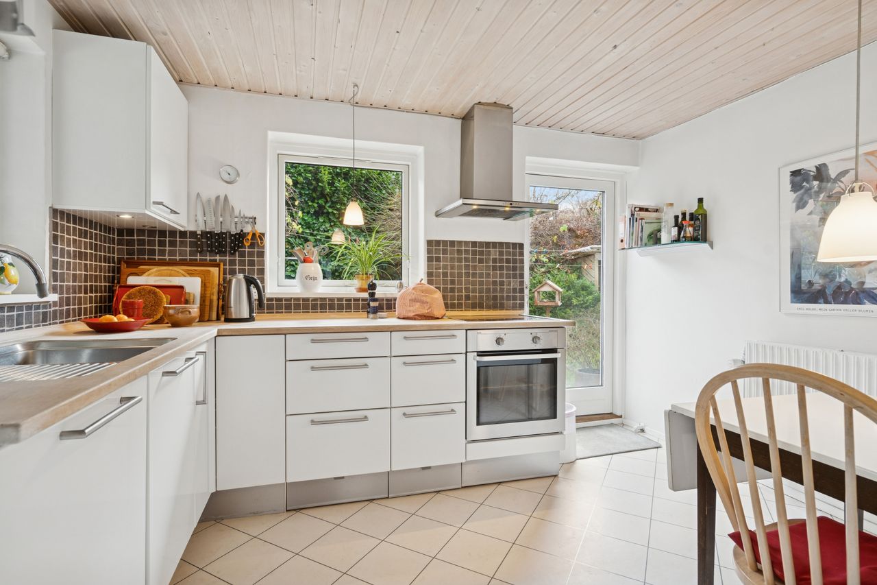 Indenfor mødes I af en indbydende entré, der fører til et praktisk bryggers, et gæstetoilet og en fordelingsgang. Herfra åbner huset sig mod den store stue, hvor de brede vinduespartier giver et fantastisk lysindfald og en smuk udsigt mod sydvest. Stuen rummer både plads til sofahygge ved brændeovnen og et naturligt spiseafsnit, hvor familien kan samles. Fra stuen er der udgang til en solrig terrasse og den ugenerede have. Køkkenet har fint med plads til madlavningen og ligeledes egen udgang til en terrasse mod sydøst. Slutteligt ligger stueetagen inde med to fine værelser.