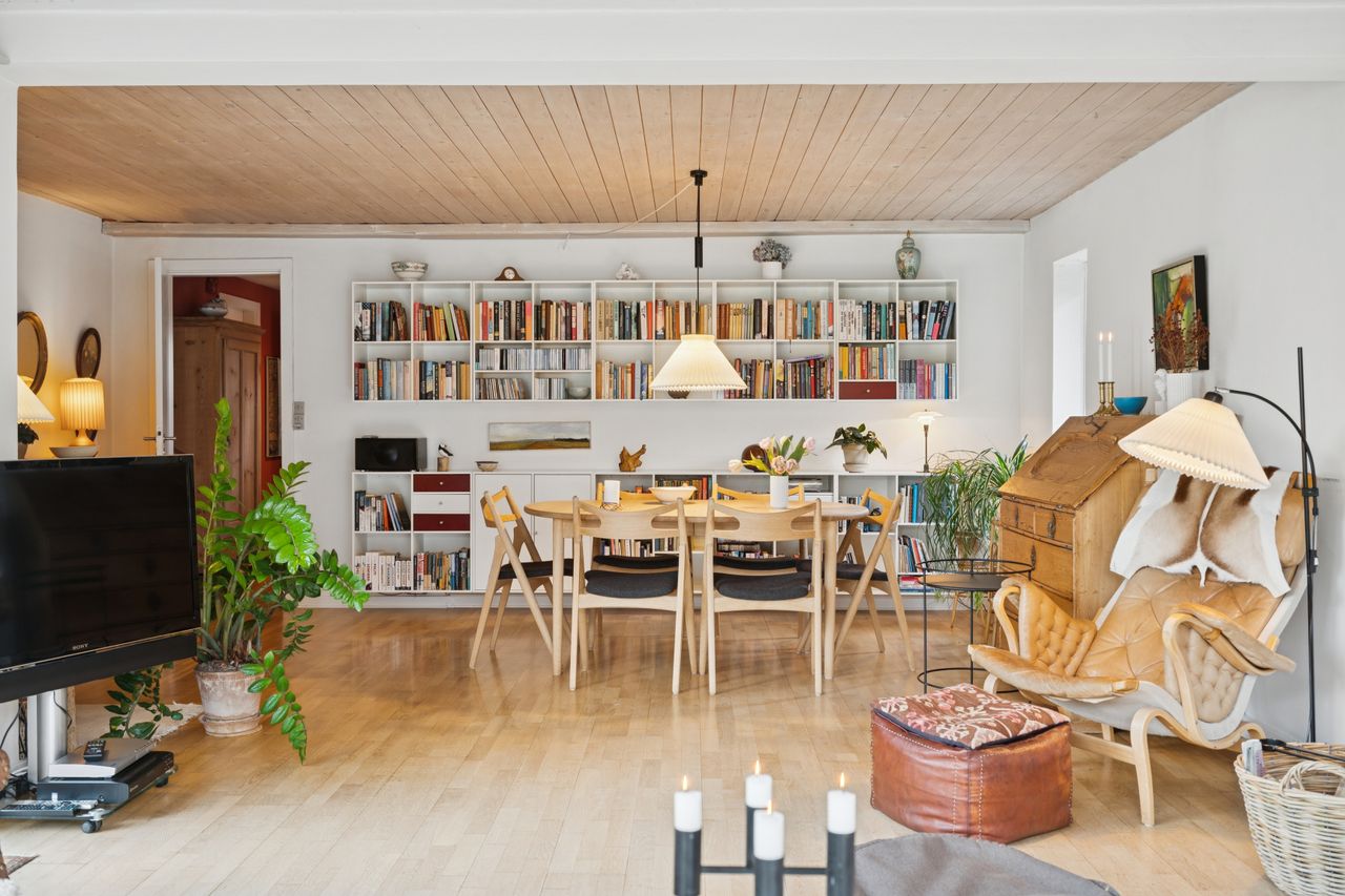 På førstesalen er kvadratmeterne godt udnyttet, hvilket har resulteret i tre store værelser og et badeværelse. Det største af værelserne får ligesom stuen gavn af et dejligt lysindfald og udsigt over haven og skoven. Herfra er der adgang til en stor tagterrasse.