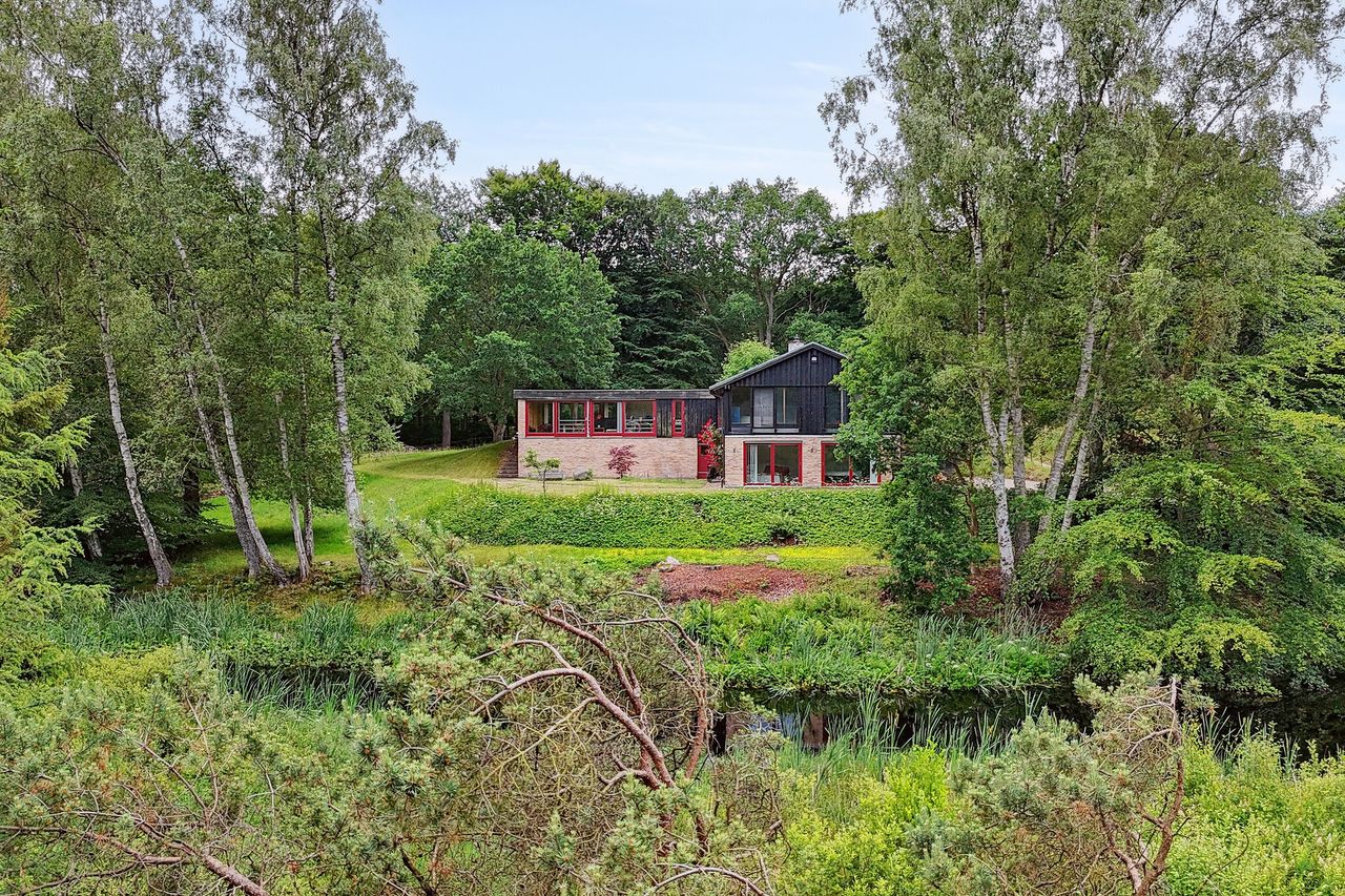 For enden af en stille skovvej til Grib Skov med udsigt over en mose ligger denne store, velholdte ejendom. Der er helt stille på den omfangsrige naturgrund, og selve ejendommen på 370 etagemeter er ligeledes fuld af muligheder. Kvalitet er et gennemgående tema i huset, som også er udført med fokus på et sundt indeklima samt spækket med unikke arkitektoniske detaljer.