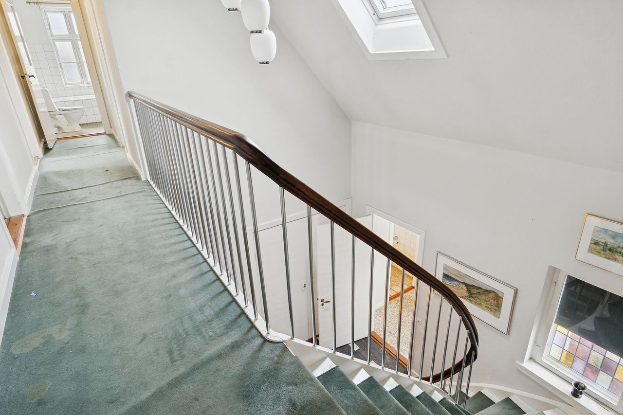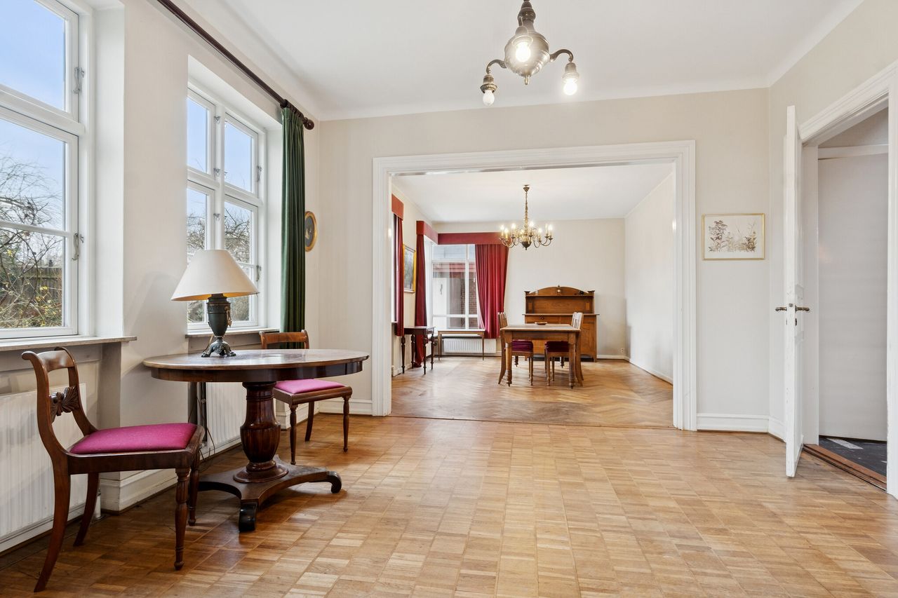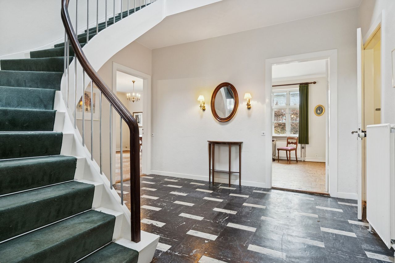 Den røde murstensfacade med dekorative gesimser, hvide, sprossede vinduer og et halvvalmet tag. Æstetikken er ganske enkelt smuk, og inden døre vil I bemærke et hav af klassiske elementer, der breder sig over tre etager. I stueplanet ses eksempelvis henrivende sildebensgulve i de 2 af stuerne, og der får de blandt andet selskab af rige lysindfald, en formidabel loftshøjde og nydelige døre, men smukkest er nu boligens herskabelige hall.
