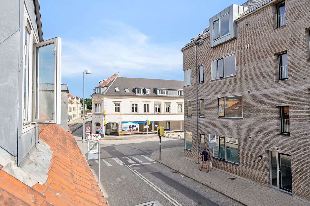 I en rolig krog af Hillerøds bymidte, hvor du hverken mærker larm eller trafik, ligger en lys og moderne ejerlejlighed, som forener det bedste af to verdener: Fredelige, historiske omgivelser og gåafstand til alt. Her bor du nemlig få skridt fra hyggelige caféer, butikker, kulturliv og Hillerød Station, ligesom du hurtigt når Slotssøen og Slotsparken til fods.