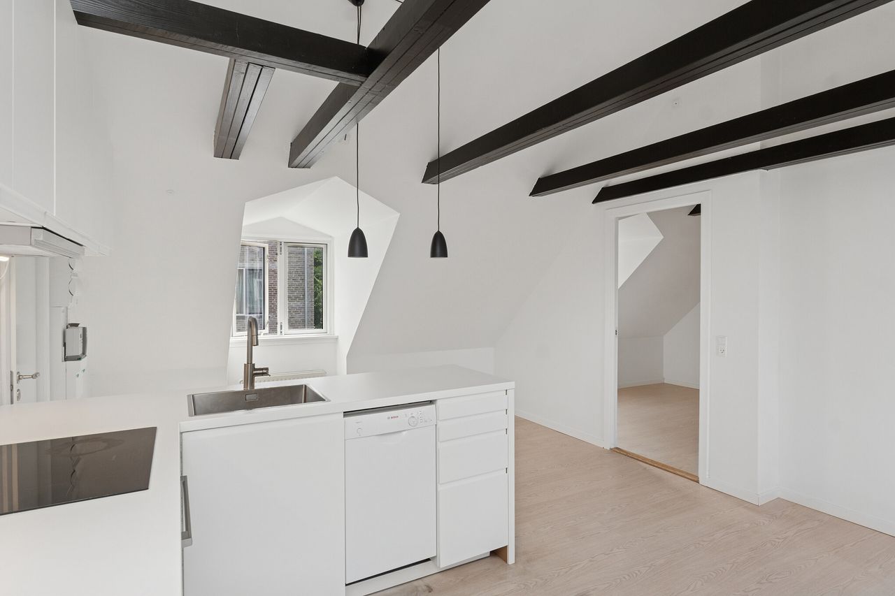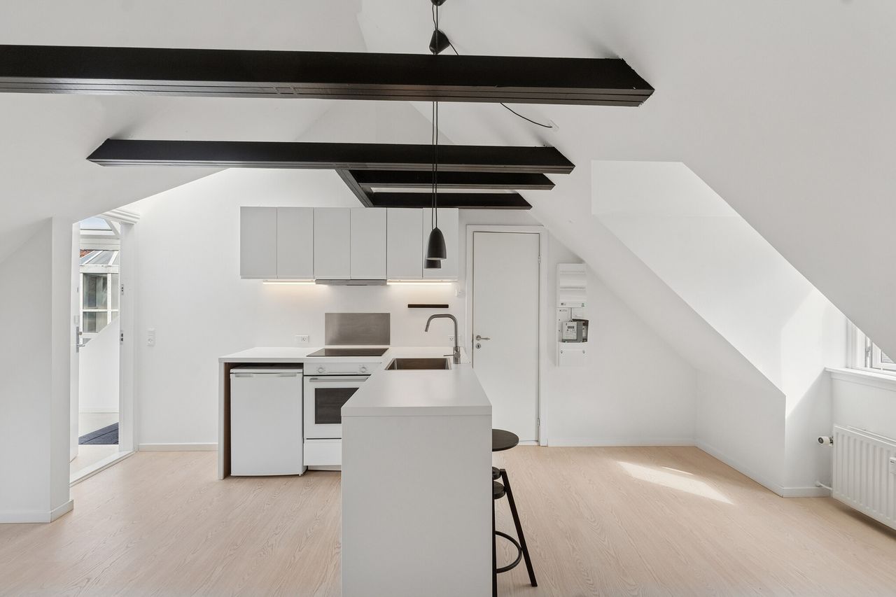 Køkken-alrummet er lejlighedens samlingspunkt, hvor der er plads til både madlavning, samvær og afslappende stunder. Særligt iøjnefaldende er loftshøjden på over tre og en halv meter, der går til kip, hvilket betydeligt forstærker rumfornemmelsen og lysindfaldet. Bemærk også den synlige bjælkekonstruktion, som sætter et charmerende præg på boligen. Dernæst kan du se frem til et lyst og rummeligt soveværelse, og også på badeværelset er der fine forhold for dagligdagens gøremål.