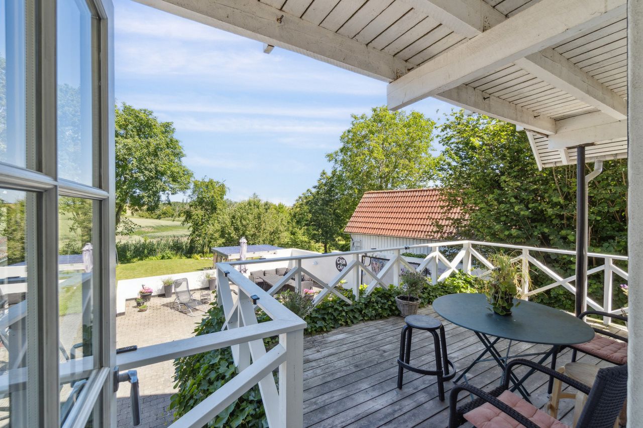 Køkkenet har udgang til den store terrasse, hvor morgenkaffen kan nydes i stilhed med horisonten som baggrund. På førstesalen findes to meget rummelige værelser med mulighed for opdeling samt et soveværelse med eget toilet og udgang til altan. Her opleves udsigten i sin fulde bredde – fra åbne marker til skov og bakker.