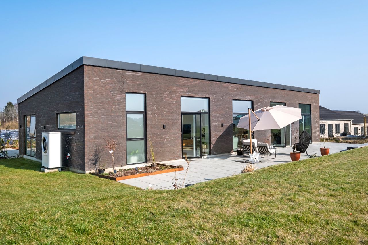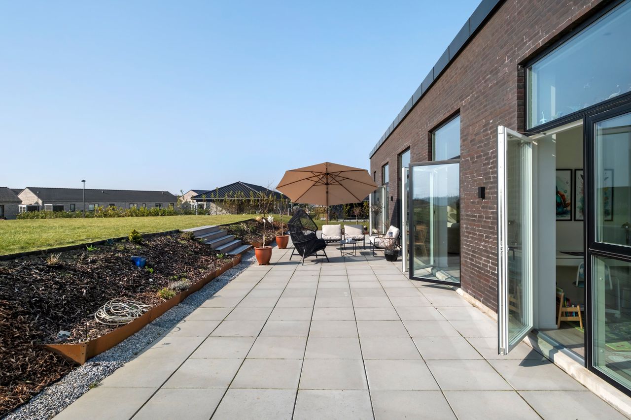 Villaen er fra 2023 og den byder på en særdeles god planløsning med et stort og åbent opholdsområde centralt i huset. I får her en stor, lys stue med 3,39 meter til højeste punkt på loftet og et åbent flow, der starter helt ude ved entréen og fortsætter på den anden side af den rummelige stue til køkkenet, der er fra Svane og blandt andet udstyret med Quooker og bordplade fra Dekton. Fra både køkkendelen og stuedelen af opholdsrummet er der dobbeltdøre ud til husets 2 store terrasser.