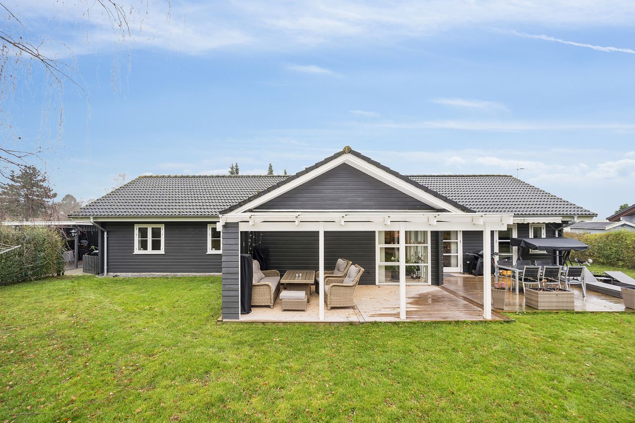 Så snart I træder ind på grunden, mærker I roen, idet både haven og huset er i god stand og overskueligt at vedligeholde. Haven består hovedsageligt af græs med enkel beplantning, hvor der er plads til spil og leg, mens den sydvestvendte terrasse indbyder til afslappende stunder. I kan vælge at slå jer ned under åben himmel eller overdækningen.