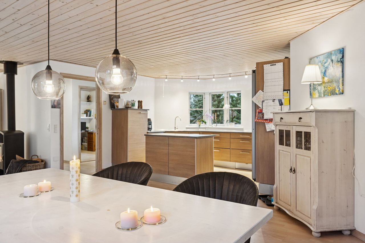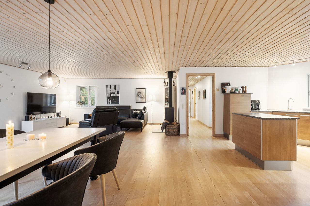 Inden døre fortsætter det pæne udtryk, og den behagelige atmosfære skyldes også, at sollyset følger med ind i hjemmet. Køkken-alrummet/stuen i midten udgør et naturligt samlingspunkt og opholdssted, hvor I får masser af rum til at indrette hyggelige sektioner. Huset rummer derudover fem værelser og to badeværelser i alt, som er fordelt i særskilte sektioner. I den ene fløj finder I således to værelser og et badeværelse, mens den modsatte ende er afsat til tre værelser, et badeværelse og et bryggers med egen indgang. I kan derfor nemt indrette boligen, så den tilgodeser både børn og voksne.