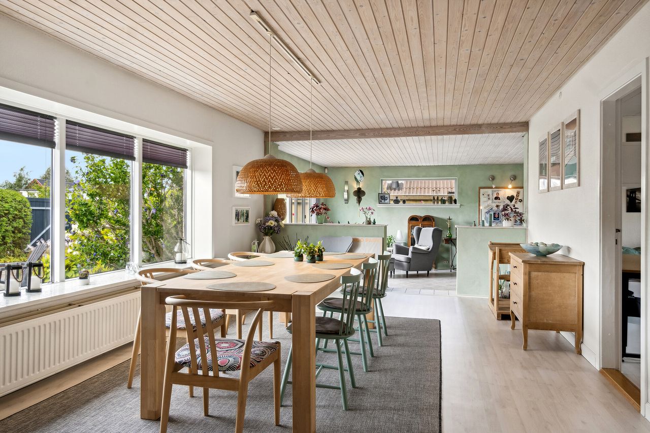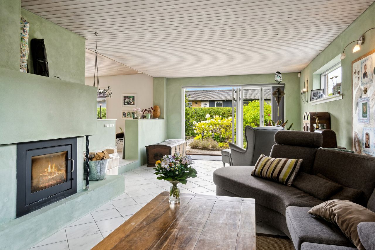 Gulstensvillaen breder sig over ét praktisk plan på 168 m2 med god plads til familielivet. I det tidløse, hvide køkken får I fine opbevaringsløsninger, og det er endda muligt at indrette en spisekrog til hverdagens små måltider. Fra køkkenet er der desuden direkte adgang til bryggerset. I den rummelige vinkelstue er der dejligt med plads til at etablere en spiseafdeling i den ene del, mens de bløde møbler kan arrangeres foran brændeovnen. Bemærk også, hvordan de velplacerede vinduespartier sørger for rige mængder dagslys.