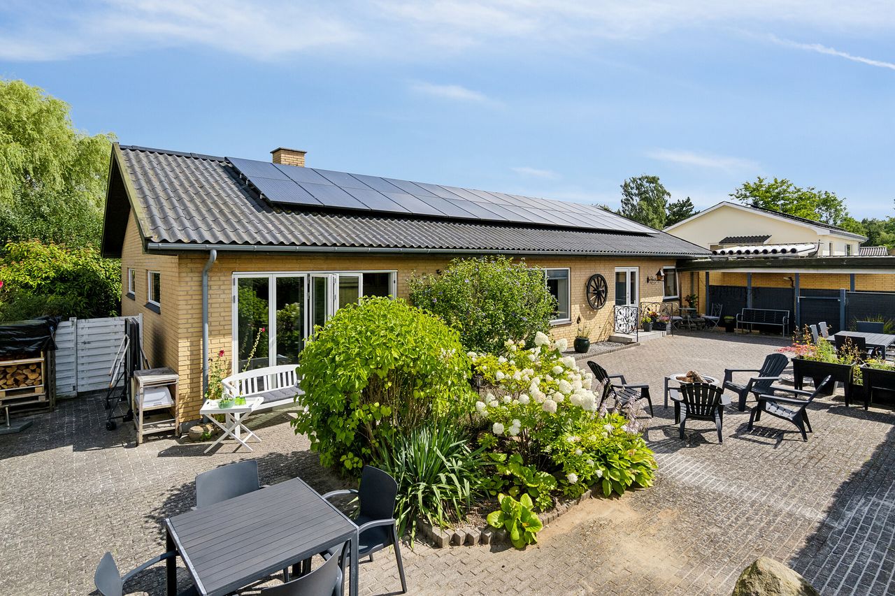 Ude venter en frodig og meget hyggelig have med masser af køn, varieret beplantning, der alt sammen er med til at skabe et stemningsfuldt udemiljø at opholde sig i. Det vældige terrasseområde er perfekt orienteret mod syd, og den lukkede have byder endvidere på flere skønne oaser, blandt andet ved drivhuset. Til huset hører der også en dobbelt carport samt et isoleret skur.