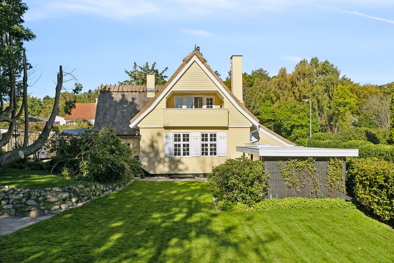 Glæd jer til at se denne imponerende ejendom, der præsenterer sig med et flot (nytækket) stråtag, smørgule facader og hvide sprossevinduer. Der er også en integreret garage. Det klassiske udtryk er velbevaret udvendigt, og også indvendigt opleves mange originale detaljer.