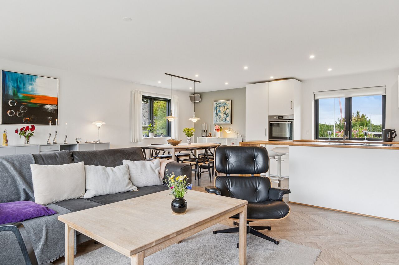 Allerede udefra imponerer ejendommen med sin lyse facade samt vinduer, døre og tag, der alle blev udskiftet i 2021. Indenfor får I glæde af 113 m2, hvor der er gulvvarme i de fleste rum, og I kan samtidig glæde jer over fantastiske lysindfald, som skaber en helt særlig atmosfære. Samlingspunktet er køkken-alrummet og stuen, som smelter sammen i én herlig forening. Køkkenet er nydeligt med hvide skabe og skuffer, der flot prydes af træbordplader. Her er der klinkegulv, mens alrummet og stuen har smukt gulv i sildebensmønster. Modsat opholdsrummene har I værelsesafdelingen, der inkluderer tre fine værelser samt både gæstetoilet og et nydeligt badeværelse med væghængt toilet, flot badeværelsesmøbel og bruseniche. Indearealerne afrundes af det praktiske bryggers.