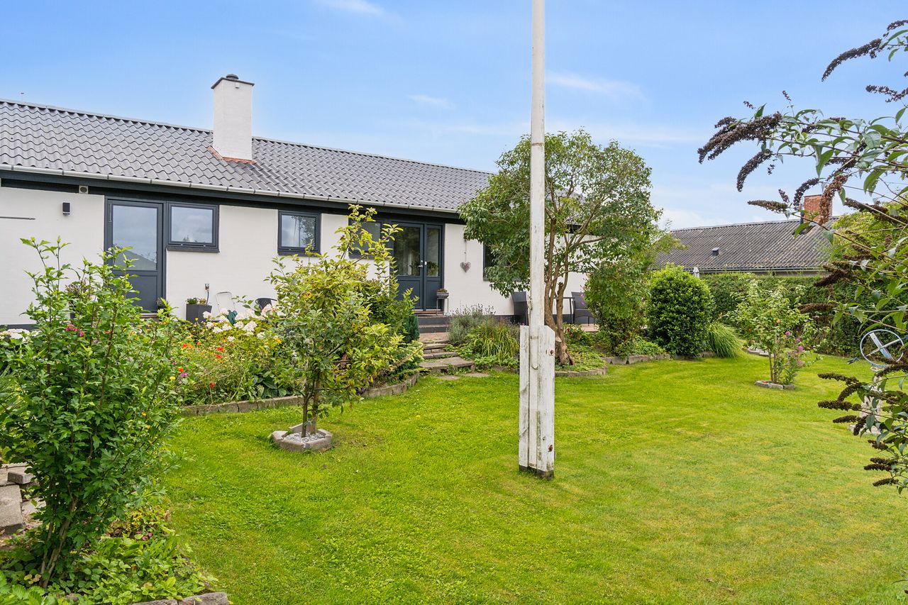 Det er ikke til at se, at denne villa er opført i 1968 takket være en gennemgribende renovering i 2021, hvor huset blev istandsat, hvilket gør, at boligen i dag fremtræder som et nyt hjem, der er lige til at rykke ind i. Derudover kan I også se frem til en særdeles fortrinlig beliggenhed i Skærød.