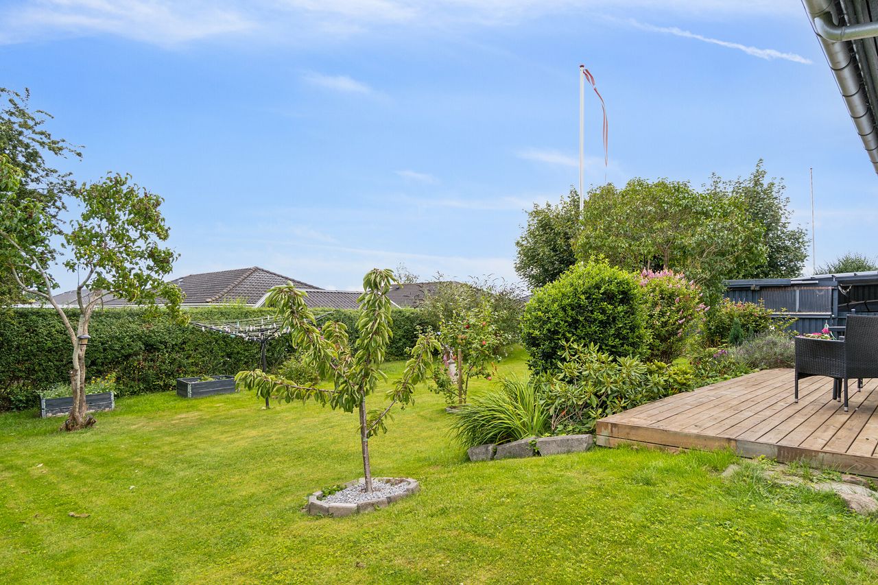 Udenfor får I fornøjelsen af en dejlig og overskuelig have, der indbyder til ro og afslapning på den store træterrasse, som fordelagtigt er orienteret mod sydvest. Rundt på grunden er der anlagt græsplæne, træer, buske og forskellige blomster, som sikrer et smukt uderum. Dertil er det også værd at bemærke den hyggelige pergola, hvor I kan arrangere havemøblerne og nyde hinandens selskab med et glas vin.