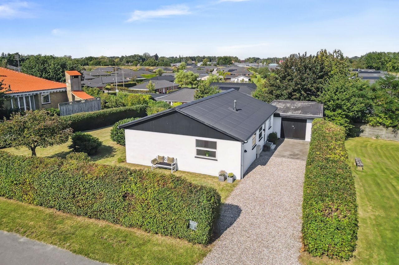 Ejendommen fremtræder velholdt med nymalede facader, nyt sadeltag fra 2024 og lavenergi-vinduer med trelags-termoruder og tyverisikring og meget mere. Også haven præsenterer sig ved ankomst. Den består hovedsageligt af græs med stedvise buske og træer, og det hele er omkranset af hæk. Bagerst på grunden er der et græsstykke med bålplads samt gode muligheder for boldspil. Helt ny robotplæneklipper medfølger.