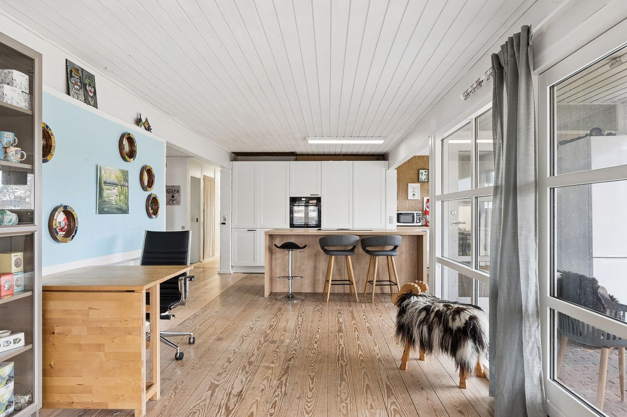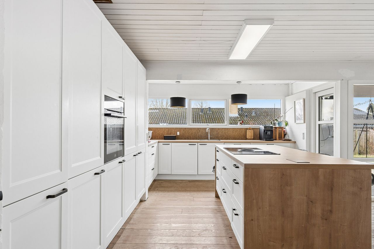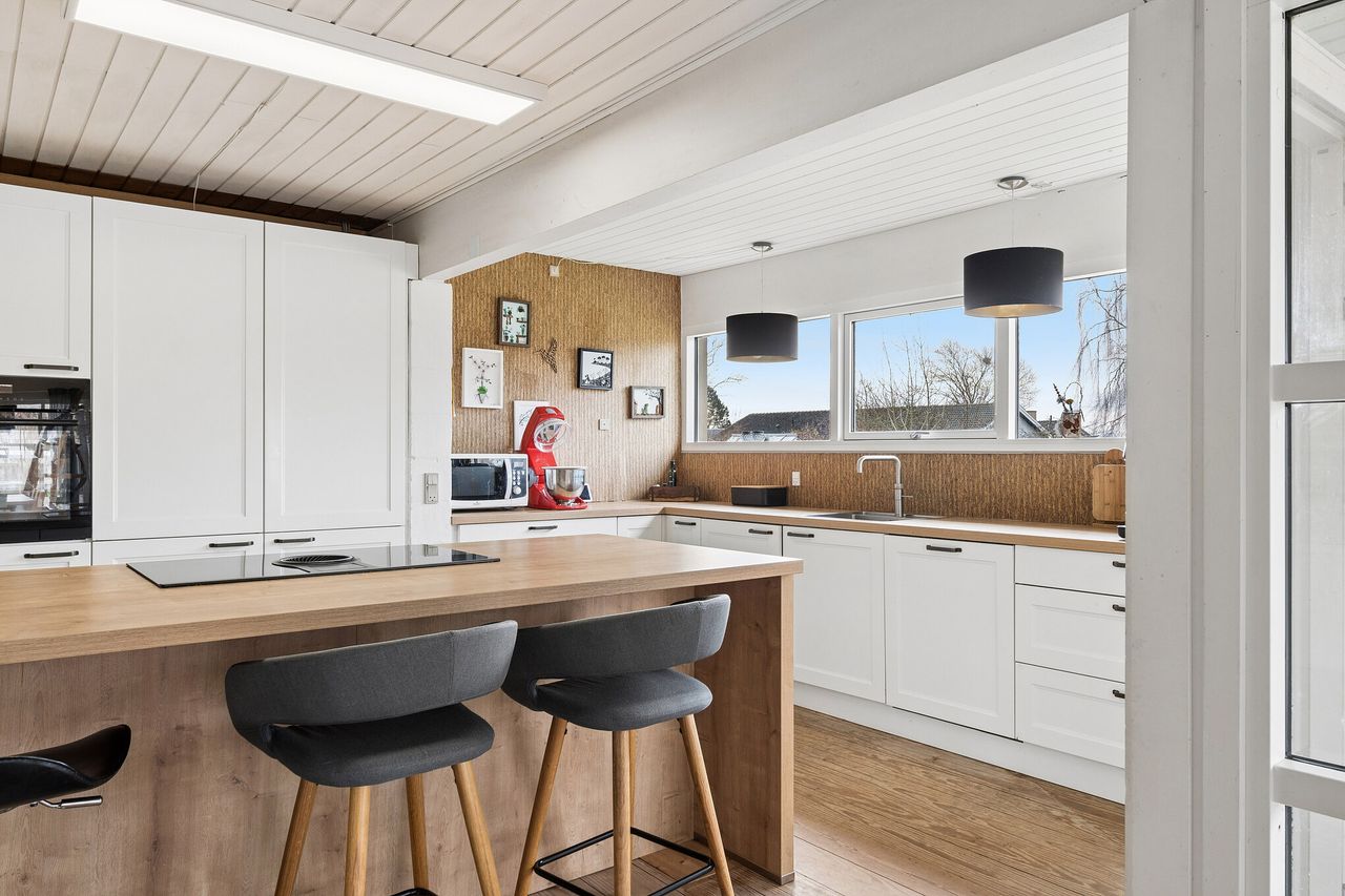 På adressen møder I den store ejendom, som præsenterer sig klassisk og med god plads. Vinduer og døre blev udskiftet i 2017, og hertil sikrer en luft-til-vand-varmepumpe fra 2016 en energieffektiv opvarmning af huset. Som de vældige vinduespartier langs facaderne vidner om, er der fantastiske lysindfald inde i boligen. Især det store, åbne køkken-alrum, hvor der er plads til at være sammen som familie på tværs af madlavning og andre aktiviteter, modtager rigelige mængder dagslys. Selve køkkenet er fra 2021 og udgør et moderne og funktionelt samlingspunkt omkring den markante kogeø.