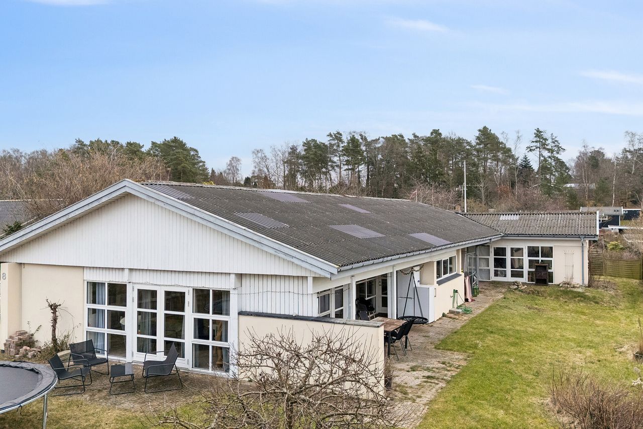 I modsatte ende af huset er der et stort værelse med fleksible indretningsmuligheder og tilsvarende skønne lysforhold, og fra begge opholdsrum er der udgange til haven. Dernæst byder planløsningen på seks rummelige værelser såvel som et stort, brugbart depotrum, og på badeværelset venter en behagelig atmosfære og velvære i form af et nedsænket spabad. Endelig får I et praktisk gæstetoilet og et bryggers med egen indgang.