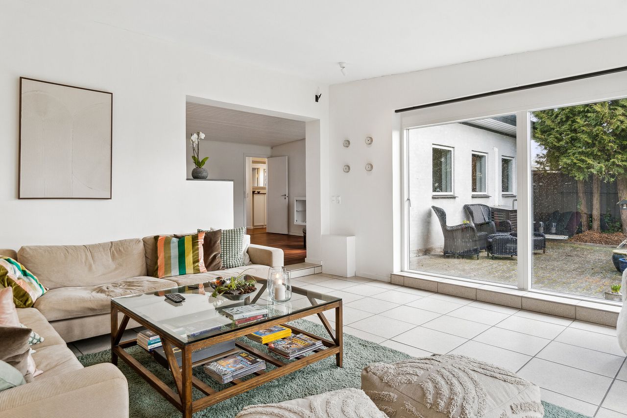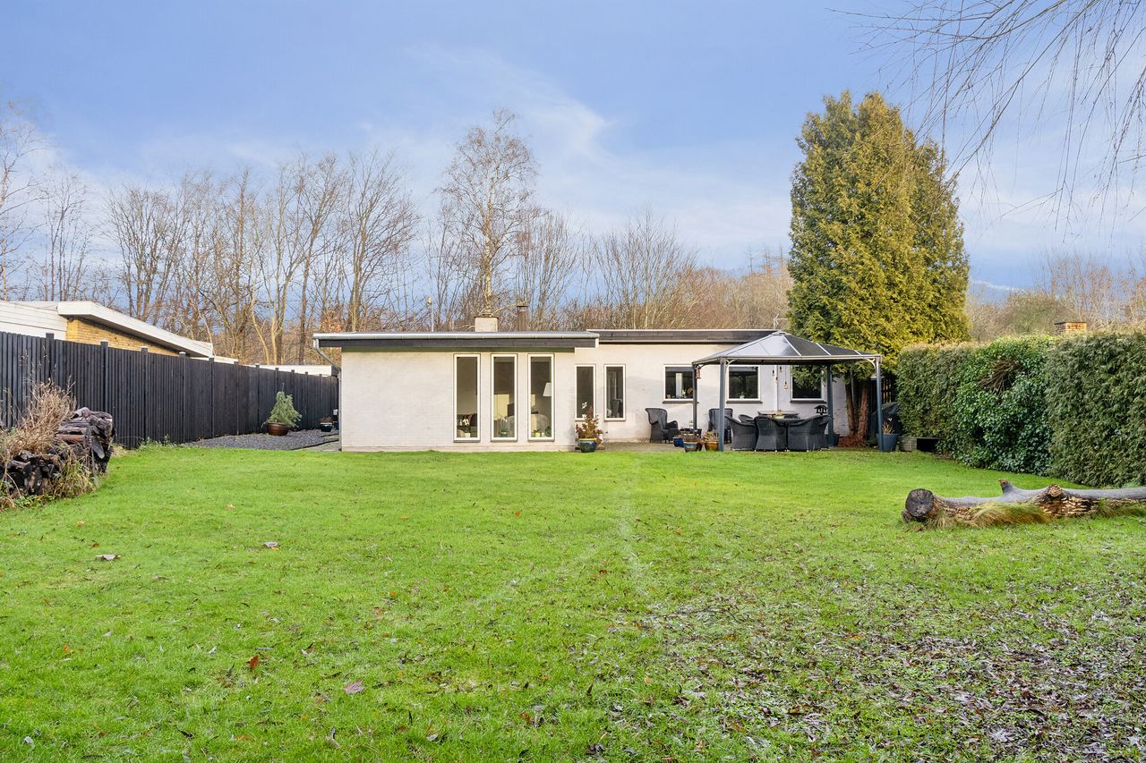 Villaen har et funktionalistisk udtryk med pudset facade, lav taghældning og forskelligartede vinduespartier, der bidrager til et eminent lysindfald. Boligens hjerte er de to stuer, der ligger i et frit flow, så det er nemt at nyde hinandens selskab på tværs af aktiviteter. Spisestuen prydes af en brændeovn, mens dagligstuen, der ligger et niveau nede, har direkte udgang til haven. Endnu et samlingspunkt er det hvide, moderne køkken, hvor I kan være sammen om madlavningen.