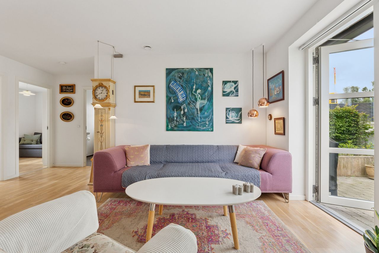 Huset er et enderækkehus, og indenfor får I glæde af et køkken i åbent forbindelse med stuen, hvilket skaber de bedste betingelser for samvær og familietid. Rummet har flotte parketgulve, og i køkkenet har I god skabsplads i de hvide elementer, der smukt toppes af en træbordplade. Hertil medfølger Siemens-hårdehvidevarer. Fra opholdsrummet er der adgang til to værelser, der begge, takket være deres størrelse, giver flere indretningsmuligheder. Mellem værelserne finder I et nydeligt badeværelse med bruseniche. Derudover er der et stort loftrum, som giver ekstra plads til opmagasinering.