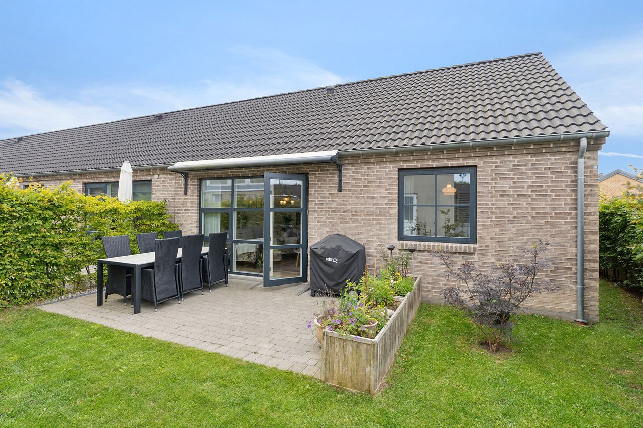 Ejendommen ligger på en endegrund med en dejlig have, hvor solrige dage kan nydes på terrassen, som er udstyret med en elektrisk markise, der kan rulles ud om aftenen. I får også jeres eget skur samt adgang til et fælles cykelskur. Har I bil, får I desuden egen plads på det fælles parkeringsområde.