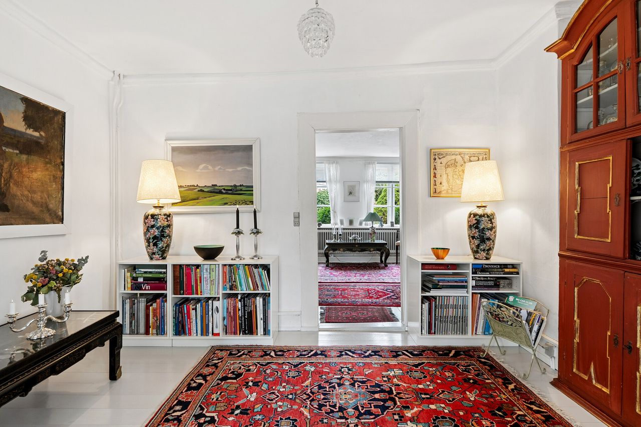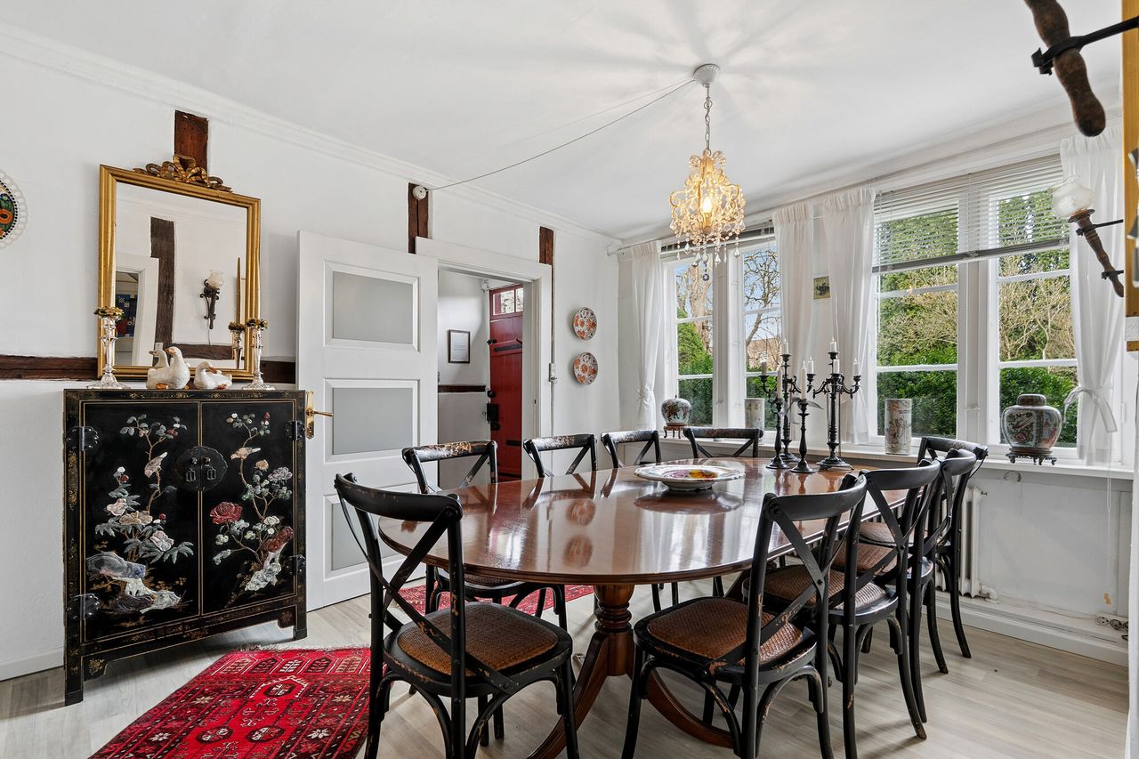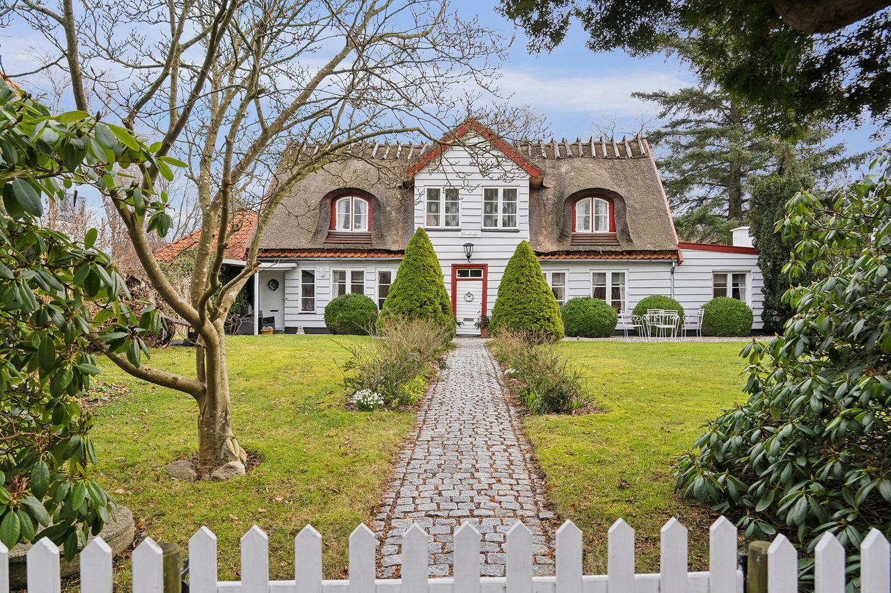 Det stråtækte hus med bindingsværk i Slotsgade 21 er et af de huse, der har været med hele vejen fra den tid, da slottet blev bygget. Det ligger ned til en lille sø, det er fra 1767, og selvfølgelig renoveret flere gange siden da. Det står i dag med alle sine 187 m2 som et minde fra den gang, da trykkefriheden kom til Danmark. Efter mange års krig ønskede Frederik IV et slot, om skulle symbolisere fred. Slottet fik derfor navnet Fredensborg, som betyder Fredens borg. Det er et historisk hus, og i den ånd er det fredet med de fordele, der kommer med lav ejendomsbeskatning. Der er bare få matrikler mellem Slotsgade 21 og Fredensborg Slot, hvor Kongen og Dronningen også har adresse. Et godt naboskab i kvarteret er altid vigtigt, også for Kongen, hvis han lige står og mangler mælk til kaffen. Grunden er på 1.462 m2. Jah, Slotsgade 21 har godt nok en helt særlig beliggenhed i Fredensborg.