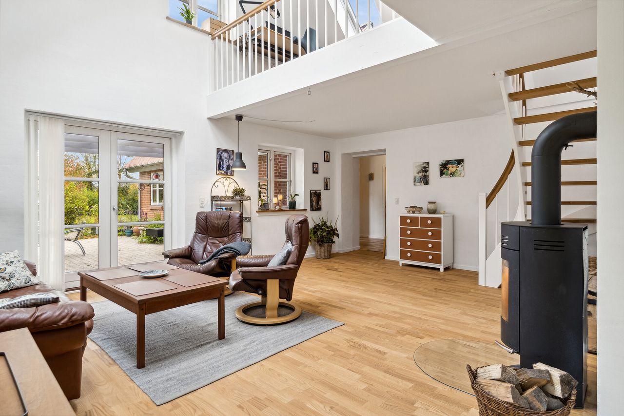 I dagligstuen er der loft til kip med kig til førstesalen og vældige ovenlysvinduer, så lysindfaldet er yderst behageligt, ligesom I kan kigge på stjerner i mørket. Hertil beriger brændeovnen stemningen med sin lune, knitrende ild, når årstiden er til det. Selve køkkenet er pænt og tidløst, og samtidig matcher det ejendommens landlige æstetik. Hele tre sæt dobbeltdøre leder ud på terrassen fra begge opholdsrum.
