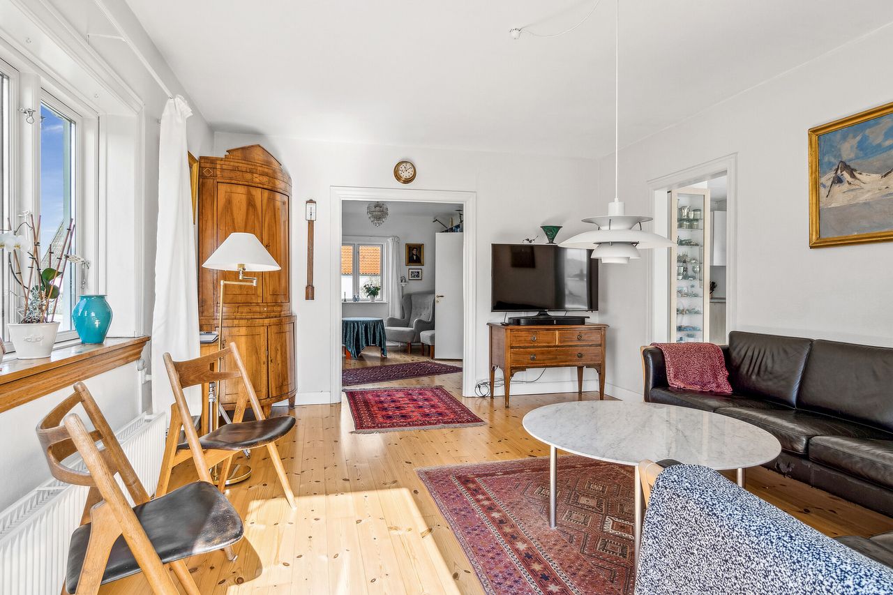 Villaen præsenterer sig pænt udefra, og det samme er tilfældet, som I træder inden døre. Her råder I over et samlet beboelsesareal på 125 kvadratmeter, der ledsages af en god kælder på 75 kvadratmeter. I stueplan finder I to stuer en suite i delvis åben forbindelse med køkken-alrummet, og hvor sidstnævnte toner frem med et enkelt design, så er det især det rige lysindfald, der kendetegner stuerne. Fra både stue og køkken er der fin udgang til skøn stor træterrasse i hele husets bredde