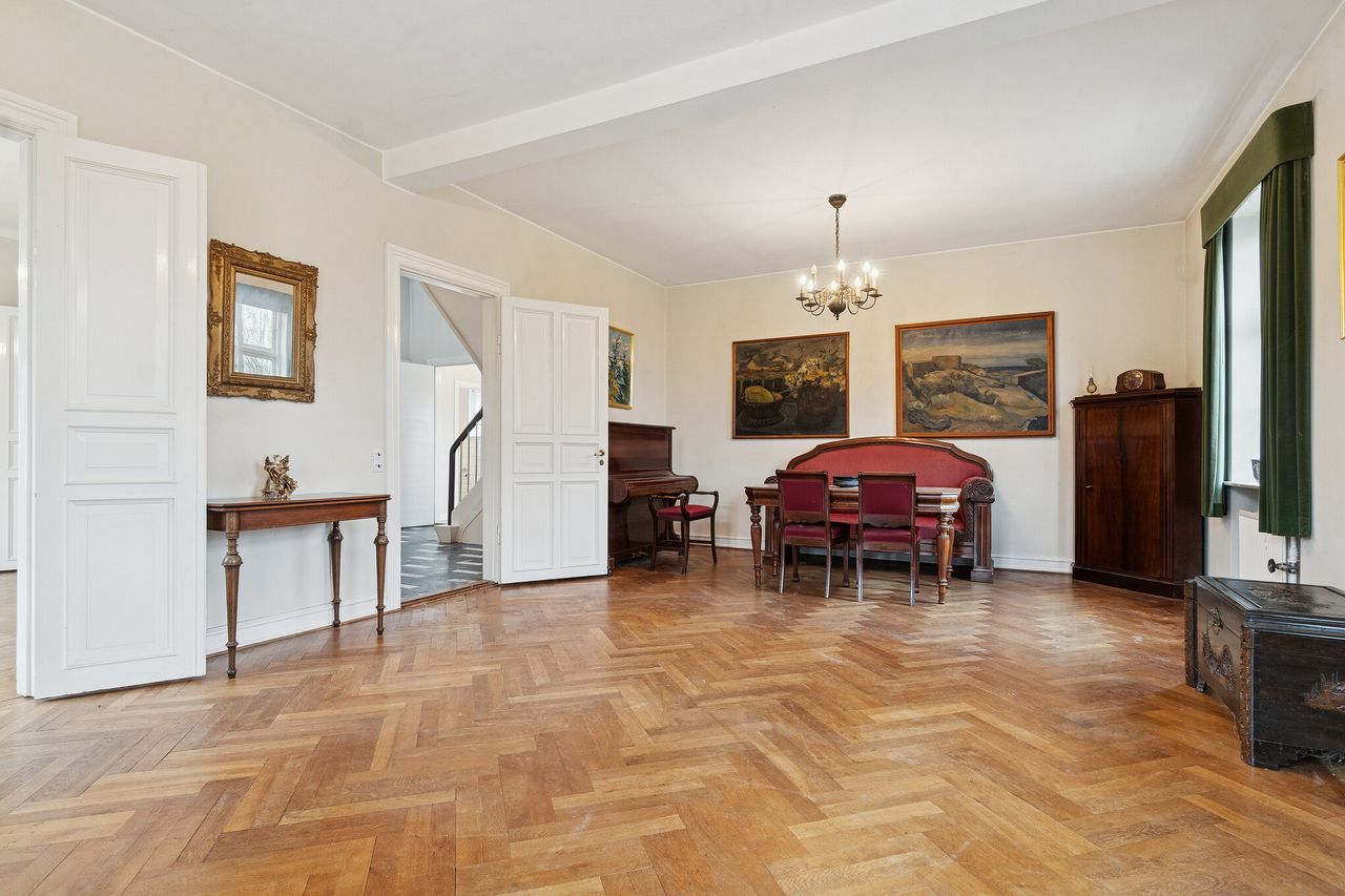 Den røde murstensfacade med dekorative gesimser, hvide, sprossede vinduer og et halvvalmet tag. Æstetikken er ganske enkelt smuk, og inden døre vil I bemærke et hav af klassiske elementer, der breder sig over tre etager. I stueplanet ses eksempelvis henrivende sildebensgulve i de 2 af stuerne, og der får de blandt andet selskab af rige lysindfald, en formidabel loftshøjde og nydelige døre, men smukkest er nu boligens herskabelige hall.